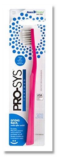 My dentist gave me one, and I like it so much I started buying them on line. Soft bristles.