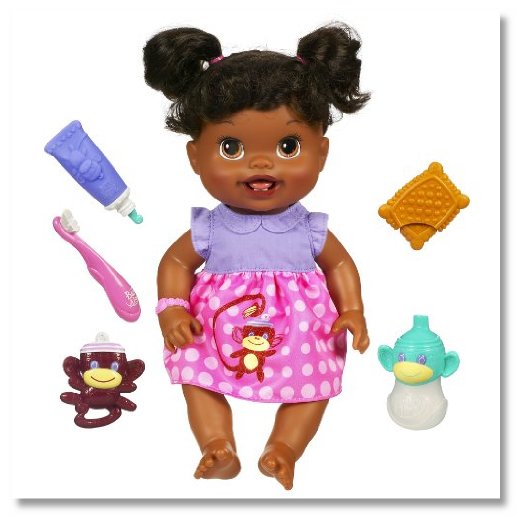 Your baby doll is getting her first set of teeth and she needs you to help care for them! Give your BABY ALIVE doll her teething toy to chew on to help with her teething. Then, press her tongue to make her new teeth magically appear! Feed her a teething cookie and watch her take a bite. Let her drink from her sippy cup and change her diaper accessory after she wets it. Then, help her brush her teeth with her toothbrush and toothpaste that squeezes out. Its up to you to teach your baby doll how important it is to take care of her teeth, just like a real mommy does!Doll comes with dress, diaper, toothbrush, toothpaste, teething cookie, teething toy and sippy cup.