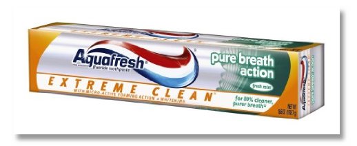 Don't let bad breath stand in the way of your day (it's okay, we've all been there). Aquafresh Extreme Clean Pure Breath Action, voted Product of the Year in 2013, helps to neutralize bad breath odors for 80% cleaner, purer breath versus non-zinc toothpaste immediately after brushing. Active Ingredient Sodium fluoride 0.25% (0.15% w/v fluoride ion) Inactive Ingredients Water, hydrated silica, sorbitol, glycerin, PEG-8, sodium lauryl sulfate, flavor, xanthan gum, titanium dioxide, cocamidopropyl betaine, sodium citrate, sodium saccharin, zinc chloride, polyethylene, iron oxides, red 30, blue 1 lake