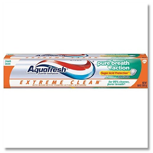 Don't let bad breath stand in the way of your day (it's okay, we've all been there). Aquafresh Extreme Clean Pure Breath Action, voted Product of the Year in 2013, helps to neutralize bad breath odors for 80% cleaner, purer breath versus non-zinc toothpaste immediately after brushing. Active Ingredient Sodium fluoride 0.25% (0.15% w/v fluoride ion) Inactive Ingredients Water, hydrated silica, sorbitol, glycerin, PEG-8, sodium lauryl sulfate, flavor, xanthan gum, titanium dioxide, cocamidopropyl betaine, sodium citrate, sodium saccharin, zinc chloride, polyethylene, iron oxides, red 30, blue 1 lake
