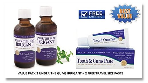 Tooth & Gums Paste is a Truly Natural professional strength toothpaste formulated with green tea extract to gently clean teeth, reduce oral bacteria and freshen breath. Precisely calculated proportions of pure essential oils work synergistically with alcohol-free extracts of organically grown herbs to maintain healthy teeth and gums. The extraordinary effectiveness of Dental Herb Company products, including our sodium lauryl sulfate-free toothpaste, is due to the unique way in which they are formulated. Precisely calculated proportions of pure essential oils work synergistically with alcohol-free extracts of organically grown herbs to reduce oral bacteria and maintain healthy teeth and gums. Under the Gums Irrigant is a Truly Natural professional strength antimicrobial herbal concentrate designed for dilution and use with an oral irrigator. It is formulated to reduce oral bacteria in periodontal pockets and to help maintain healthy teeth and gums. The irrigant contains pure essential oils and extracts of organically grown herbs, and no alcohol or artificial chemical ingredients. The extraordinary effectiveness of the Dental Herb Company products is due to the unique way in which they are formulated. Precisely calculated proportions of pure essential oils work synergistically with alcohol-free extracts of organically grown herbs. It contains no alcohol or chemical ingredients. Use Under the Gums Irrigant after brushing teeth with Tooth & Gums Paste (preferably before going to bed). Shake bottle before use. Dilute 1/3 capful (appox. 1/2 tsp.) of Irrigant with 7oz. (210ml) of water in the irrigator reservoir. Stir or shake to mix thoroughly. Irrigate around teeth and under the gums as directed by your dental professional. For best results, do not eat or drink for 15 minutes after use. Important: Rinse reservoir and flush with warm water after each use. Ingredients: vegetable glycerine, extracts of echinacea Angustifolia, echinacea purpurea and gotu kola, pure essential oils of peppermint, red thyme, cinnamon bark, eucalyptus globulus and lavender, plant saponins.