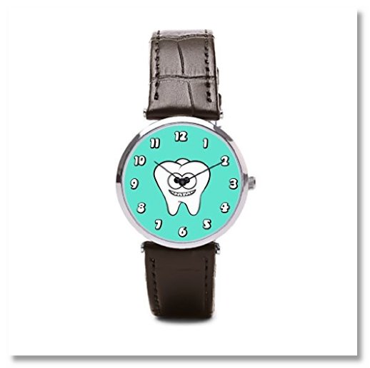 Goldtone Men's Dental Watch with Tooth on Aqua Blue Dial plus Leather Strap