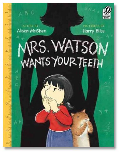 A little girl has some concerns as she starts first-grade. The story is told in the first person, and is immediately appealing from page 1. Her fears revolve around her first loose tooth, and the stuff that a second-grader tells her that causes her worry. Great story and funny, clever and cute illustrations with highly amusing background activity, and our girl wins on all fronts. When I introduced this book to my kids, I thought that the cover illustration and the story might seem scary, but they love this one. I think this covers and helps resolve children's fears: reticence at starting a new year, with a new teacher, and other new things that come with age: dealing with bigger kids, and the excitement of getting new teeth! Mrs. Watson Wants Your Teeth