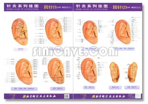This is a set of 2 charts of the ear acupoints, with laminated surface. The first chart contains four pictures indicating ear areas; the second chart describes acupoints in all areas of the ears. The charts are stored in paper tube and are great as teaching tool and reference. A 13-page booklet of brief description on the acupoints and their function is included.