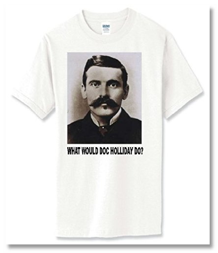 5.3 oz, 100% cotton preshrunk jersey knit Quarter-turned to eliminate center crease. John Henry "Doc" Holliday (August 14, 1851 - November 8, 1887) was an American gambler, gunfighter, and dentist, and a good friend of Wyatt Earp. He is most well known for his role as a temporary deputy marshal in the events leading up to and following the Gunfight at the O.K. Corral.