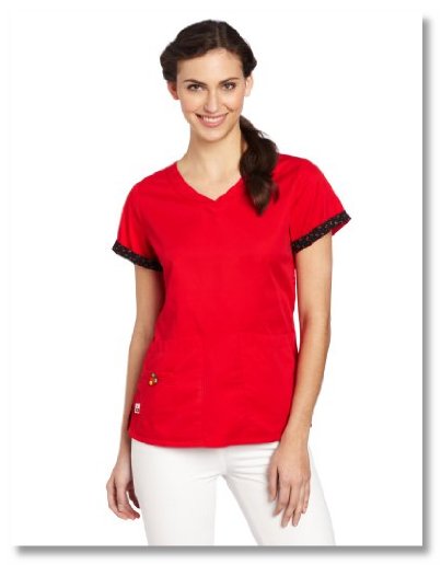 The top arrived today. I have a pair of Mary Engelbreit bright green scrub cargo pants and love them, so I thought I would try a plain black top. The accents of "cherries" are too cute and match the same accents found on the pants. Love the fabric as well. Very soft and comfy. It's like wearing pajamas to work.
