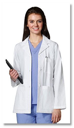 great lab coat! I'm a medical student and this is the perfect short white coat. My hospital provides lab coats, but the pockets aren't big enough to carry all wound care supplies we need to carry for surgery. This coat has 2 generous outside pockets, and a hidden one on the inside too. The hidden one is big enough for iPad air. I'm 5'3, 115 lb, and I ordered the XS. It was a perfect fit.