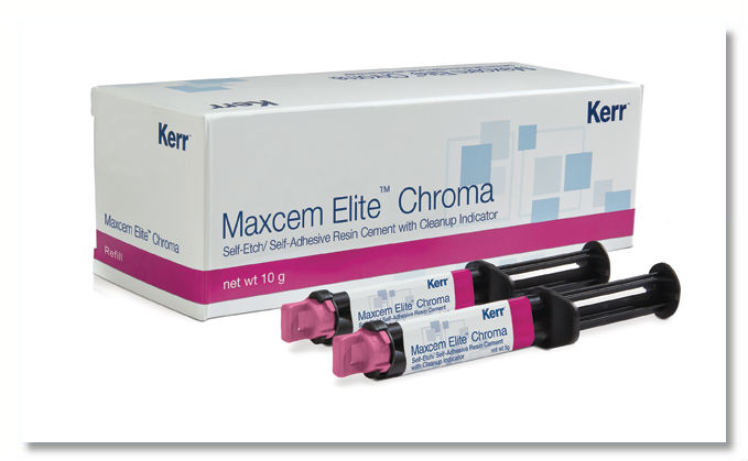 Includes: 2 Dual Barrel Syringes, 8 PINK Automix Tips (regular), 8 PINK Automix Tips (wide), 8 Intraoral Tips, IFU, Technique Card Maxcem Elite™ Chroma is the first Self-Etch/ Self-Adhesive resin cement offering a Color Cleanup Indicator, dispensing pink before fading at the gel state, telling you the optimal time to cleanup excess cement. Compatible with all indirect restorations, including ceramics, PFMs, Zirconia and metal restorations, and CAD/CAM material.