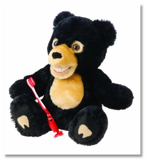 This little bear is very cute and works great at teaching kids to brush properly. He is very soft and adorable. Plus he does come with a toothbrush that works great and has suction cups on the bottom to stick to the side of the sink. I am impressed and my son likes it.