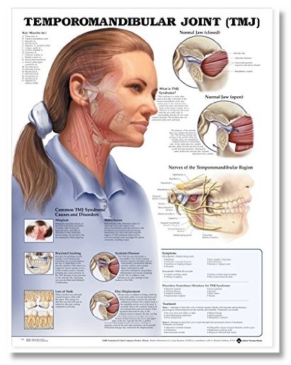 This chart defines temporomandibular joint (TMJ) syndrome. It illustrates the normal jaw closed and open, and the nerves of the temporomandibular region. The chart shows and explains common causes and disorders and lists symptoms, disorders sometimes mistaken for TMJ syndrome, and treatment options. Shows and explains disorders: whiplash; bruxism/clenching; loss of teeth; malocclusion; systemic diseases; and disc displacements.