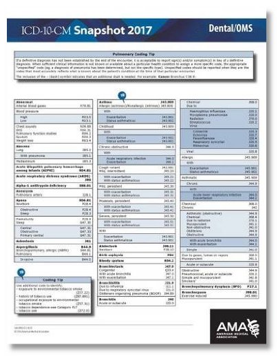 The ICD-10-CM 2017 Snapshot Coding Cards provide commonly reported diagnostic codes and associated guidelines for a specialty. Pushpin icons help Snapshot users connect coding tips back to specific codes. These easy-to-use reference cards allow health care providers and staff members to quickly locate a desired code.
