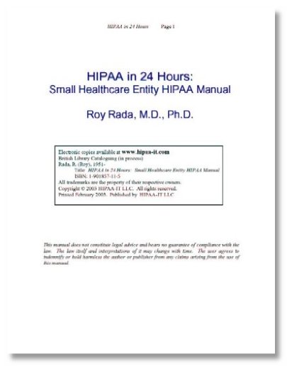 This document is published in the form of a short paper - only 34 pages, stapled together. However, it really does provide everything that a small organization needs to implement HIPAA in only 24 hours of effort. It provides a good explanation of the principles behind the laws, briefings for the executive(s) or an organization and its staff, a project timeline, workflows, and sample policies & forms. Bravo!