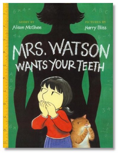 A little girl has some concerns as she starts first-grade. The story is told in the first person, and is immediately appealing from page 1. Her fears revolve around her first loose tooth, and the stuff that a second-grader tells her that causes her worry. Great story and funny, clever and cute illustrations with highly amusing background activity, and our girl wins on all fronts. When I introduced this book to my kids, I thought that the cover illustration and the story might seem scary, but they love this one. I think this covers and helps resolve children's fears: reticence at starting a new year, with a new teacher, and other new things that come with age: dealing with bigger kids, and the excitement of getting new teeth! Mrs. Watson Wants Your Teeth