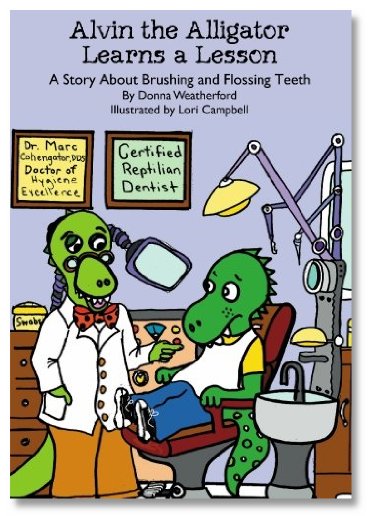 Alvin the Alligator pretends to brush and floss his seventy-eight teeth, and ends up with alli-tosis and a cavity.