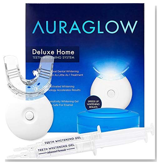 Let's face it, store-bought teeth whitening strips and moldable trays are hard to use, messy and deliver poor results. Teeth whitening at the dentist is expensive and takes hours. With the AuraGlow Teeth Whitening Kit, you can get noticeable results after 1 treatment in just 30 minutes per day. Once you experience our teeth whitening kit, you'll never go back to store-bought brands or unpleasant dentist visits. LED Light Teeth Whitening Ditch low-quality teeth whitening lights with 1 LED bulb and experience our 5x more powerful blue LED accelerator light that delivers faster whitening results. The light attaches to the mouth tray and shines directly onto the teeth to accelerate the whitening gel process. For your convenience, the light beeps in 10 minute intervals so you don't have to look at a clock or keep track of time during each whitening session. Mouth Tray The one-size-fits-all-mouth tray is a perfect fit for any mouth - which means no confusing instructions and hours wasted boiling moldable trays. The mouth tray is made of food grade silicone and sits snug in the mouth covering both the top and bottom teeth for whitening. Dental-Grade Teeth Whitening Gel Our teeth whitening gel is 35% carbamide peroxide, which is a form of peroxide used for whitening. Our gel has just the right balance of ingredients to deliver fast whitening results with no sensitivity. All gels are made in the USA making them safe and effective. What's Included: - Teeth Whitening LED Light (batteries included)