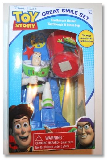 After opening my daughters cinderella "Royal Smile Set" from the same manufacturer, I was excited to also open my son's Toy Story "Great Smile Set". However, the product design is very poor as the cup is positioned to rest on Buzz's knee while being cradled by his arm. Even I as an adult have a hard time getting the cup to rest at just the right angle on Buzz's knee, so it's frustrating for a child to have to try over and over again. God forbid if you accidentally touch the base, have to move it, or want to get the toothbrush out before picking up the cup.