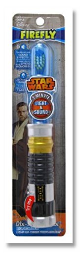 Know the power of The Force with the Firefly Star Wars Lightsaber Toothbrush! Inspired by the Star Wars movies, this lightsaber toothbrush keeps children entertained with real-voice sound effects and cool light-up effects like Obi-Wan Kenobi's lightsaber. This lightsaber toothbrush features soft, rounded, premium DuPont Tynex bristles so they are gentle on children's teeth while providing a through cleaning. The 1-minute light up timer and sound effects helps build good brushing habits and teach kids the dentist-recommended time for proper cleaning of each row of teeth. The ergonomic handle makes this lightsaber fun and easy to use. Firefly is dedicated to helping create good oral care habits at an early age by entertaining children into good oral care habits!