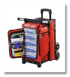 Extensive Hi-Vis 270-piece mobile trauma first aid station that meets OSHA guidelines and ANSI standards; can be wheeled directly to any medical emergency - large or small. This compact mobile station is organized in quick-response first aid modules for rapid response and treatment. Extensive First Aid supplies are designed to effectively treat traumatic injuries and include a flexible evacuation stretcher. Unique dual wheel design aides in rapid response and makes climbing curbs and stairs easy. An integrated seat and gear platform allow patient to sit and be treated or can be used to haul additional equipment (e.g. AED, oxygen tank, etc.). Highly visible markings, flashing LED wheels, and an 8-foot extendable flag make the mobile station easy to spot in any situation. Super-durable, light-weight frame construction (supports up to 300 lbs.) and heavy-duty weather resistant bag safeguard contents. Telescoping handle retracts for compact storage in less than 2 cubic feet (12.25- x 18.5- x 14.0-). Superior mobility, organization, and supplies make this next-generation trauma first aid station the perfect replacement for heavy trauma backpacks and duffel bags or stationary wall-mounted first aid kits. Special Features: Compact/Comprehensive First Aid Station: 250-piece first aid station that meets OSHA guidelines and ANSI standards; includes flexible evacuation stretcher; stores in 2 cubic feetQuick-access organization: extensive first aid supplies organized in quick-response modules for fast access and effective treatmentEasy-roll transport: dual 4" polyurethane wheels aid in rapid-response and climb stairs or curbs with little effortSeating and gear platform: allows for patient to be seated while being treated or to aid in the transport of additional medical equipment (e.g. AED, oxygen tank, etc.)Easy identification: high visibility markings, 8-foot extendable flag, and flashing (red/blue) LED wheelsDurable protection for supplies: super-durable, light-weight frame construction (supports up to 300 lbs.) and heavy-duty weather resistant bag safeguard contentsContents: - Quick-Response Pockets: