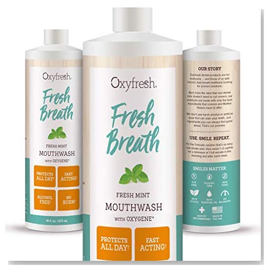 Oxyfresh's professional strength mouthwashes are uniquely formulated with an exclusive, proprietary ingredient Oxygene® that is clinically proven to effectively eliminate bad breath, leaving your mouth refreshingly clean. All day lasting fresh breath with this tasty fluoride-free formula. This refreshing mouthwash is naturally flavored with mild, minty essential peppermint oil to soothe and cool sensitive gums and teeth. Plus, sweetened with xylitol, a natural ingredient that fights plaque. Fresh breath shouldn't sting. Like all of our mouthwashes, Fresh Mint is alcohol-free with no harsh ingredients or dyes. Ingredients Water (Aqua), Xylitol, Sodium Chlorite (Oxygene® - Stabilized Chlorine Dioxide), Sodium Benzoate, Potassium Phosphate, Mentha Piperita (Peppermint) Oil, Sodium Hydroxide