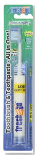 The Fresh & Go Toothbrush comes with a snap-on cap and enough refreshing fluoride toothpaste to last for as many as 30 brushings. The easy-to-grip cylindrical handle of each brush is packed with paste: just twist the dial and mint-flavored toothpaste flows easily onto the soft round-ended bristles. Fresh & Go provides the convenient way to brush whenever one feels the need or urge to brush. The Fresh & Go toothbrush is neat and handy: it fits in a handbag, glove compartment, desk drawer, backpack, briefcase, or gym bag. Use the Fresh & Go Toothbrush anytime: before a meeting or after lunch, at school or at the gym, while camping or travelling anywhere. Use the Fresh & Go Toothbrush at home too: it's the perfect toothbrush if you like to brush in the shower, it's a thoughtful gift for family members who visit, it's a fun brush to use every morning and evening. Toothbrushes come in an assortment of colors. This pack of Fresh & Go toothbrushes stocks your cabinets so travel toothbrushes are always on hand for family members to bring to work, school, business trips, or the gym. The set comes with 24 adult toothbrushes—all with the convenient Fresh & Go design that carries the toothpaste right in the handle. Users turn the dial on the neck of the brush and toothpaste gently squirts up the handle and between the bristles, providing up to 30 brushings before needing replacement. All Fresh & Go toothbrushes have long handles and angled compact heads to reach back teeth more easily, and soft, rounded bristles to help remove plaque and protect gums. In addition, the included fluoride toothpaste (mint-flavored) is accredited by the American Dental Association. When brushing is complete, each toothbrush has a snap-on cap that goes over the brush head for complete hygiene. Besides home use, this pack is ideal for stocking small businesses, such as dentists? offices, health clubs, or hotels. —Cristina Vaamonde