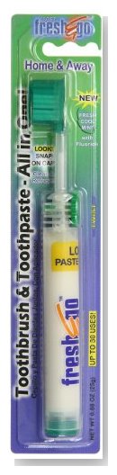 The Fresh & Go Toothbrush comes with a snap-on cap and enough refreshing fluoride toothpaste to last for as many as 30 brushings. The easy-to-grip cylindrical handle of each brush is packed with paste: just twist the dial and mint-flavored toothpaste flows easily onto the soft round-ended bristles. Fresh & Go provides the convenient way to brush whenever one feels the need or urge to brush. The Fresh & Go toothbrush is neat and handy: it fits in a handbag, glove compartment, desk drawer, backpack, briefcase, or gym bag. Use the Fresh & Go Toothbrush anytime: before a meeting or after lunch, at school or at the gym, while camping or travelling anywhere. Use the Fresh & Go Toothbrush at home too: it's the perfect toothbrush if you like to brush in the shower, it's a thoughtful gift for family members who visit, it's a fun brush to use every morning and evening. Toothbrushes come in an assortment of colors. This pack of Fresh & Go toothbrushes stocks your cabinets so travel toothbrushes are always on hand for family members to bring to work, school, business trips, or the gym. The set comes with 24 adult toothbrushes—all with the convenient Fresh & Go design that carries the toothpaste right in the handle. Users turn the dial on the neck of the brush and toothpaste gently squirts up the handle and between the bristles, providing up to 30 brushings before needing replacement. All Fresh & Go toothbrushes have long handles and angled compact heads to reach back teeth more easily, and soft, rounded bristles to help remove plaque and protect gums. In addition, the included fluoride toothpaste (mint-flavored) is accredited by the American Dental Association. When brushing is complete, each toothbrush has a snap-on cap that goes over the brush head for complete hygiene. Besides home use, this pack is ideal for stocking small businesses, such as dentists? offices, health clubs, or hotels. —Cristina Vaamonde