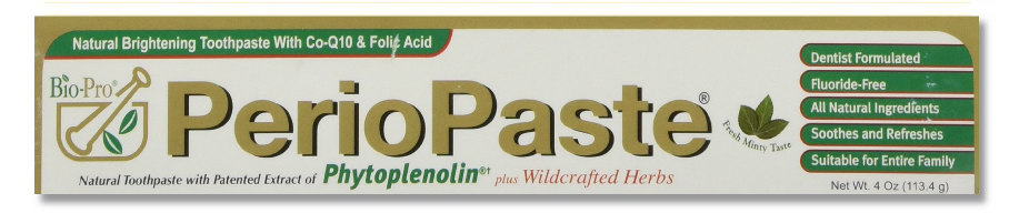 Bio-Pro offers a dentist formulated professional strength oral health program featuring organic and responsibly wildcrafted herbs and the patented extract of phytophenolin which promotes cell vitality. Bio-Pro products are free of alcohol, synthetic chemicals and solvents, sodium lauryl sulfate, artificial sweeteners, colors & dyes. Bio-Pro offers a refreshing cool mint flavor in vegetarian, cruelty-free, kosher formulas. These products are safe for cosmetic restorations and suitable for the entire family. The purity and potency of these products is assured by Bio-Pro's FDA registered pharmaceutically licensed USA facility. Research has determined that there are more than 350 species of micro-organisms that have been isolated from the human mouth. Bio-Pro has combined over 22 active herbs, essential oils, vitamins and minerals, that together target all of possible combinations of these microbes. This blend of all natural ingredients discourages the growth of micro-organisms and encourages a natural resistance to these bacteria resulting in healthier gums and brighter and whiter teeth. PerioPaste promotes healthy teeth and gums by offering more than other "natural" toothpastes. It blends Lysine with key herbs, essential oils and the patented extract of Phytoplenolin. Used regularly, this vegetarian, low abrasive toothpaste naturally whitens teeth and leaves breath fresh and clean for hours. PerioPaste is fluoride-free, preservative-free and sodium-lauryl-sulfate-free. PerioPaste leaves teeth feeling clean and smooth. Your whole mouth is energized with a cool, sparkling sensation that will last long after you finish brushing.